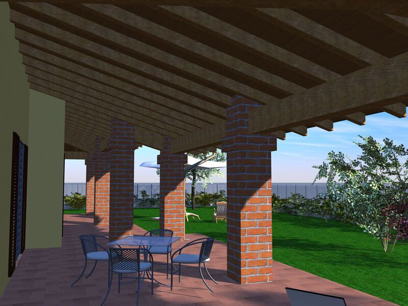 Colonne in pietra a vista sorreggono il coperto in legno creando un ampio porticato che si sviluppa su due lati del fabbricato proteggendo gli accessi e creando uno spazio esterno fruibile durante il periodo estivo.